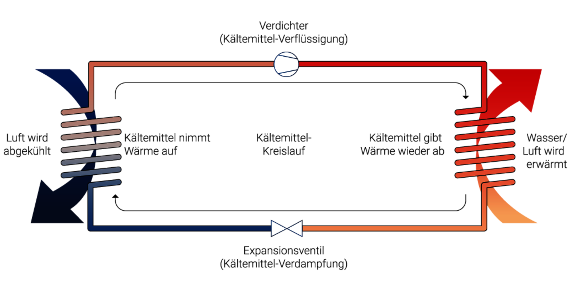 Eine Luft-Wasser-Wärmepumpe ist eine besonders platzsparende Wärmepumpe mit vergleichsweise geringen Anschaffungskosten. Sie kann im Außenbereich oder im Keller installiert werden. Diese Wärmepumpe nutzt die Wärme aus der Umgebungsluft für die Energiegewinnung. Ein Ventilator saugt die Umgebungsluft an und bringt sie zu einem eingebauten Luft-Wärmetauscher. Das darin enthaltene Kältemittel kommt mit der warmen Außenluft in Verbindung, erwärmt sich bis es schließlich zu verdampfen beginnt. Nach der Verdichtung und der anschließenden Verflüssigung kann die so gewonnene Wärme zum Heizen oder zur Warmwassergewinnung genutzt werden.